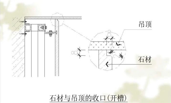 石材墻面與頂面接口處設(shè)置凹槽、倒角、留空等工藝處理!