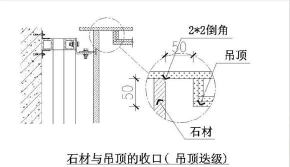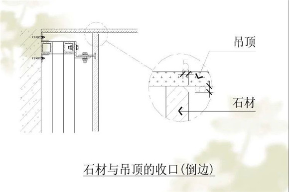 4、吊頂設(shè)置凹槽:吊頂周邊設(shè)置迭級或凹槽,墻面石材http://www.stonebuy.com/直接置頂,同時(shí)墻面頂端石材http://www.stonebuy.com/正面以2mm*2mm的45°倒角。