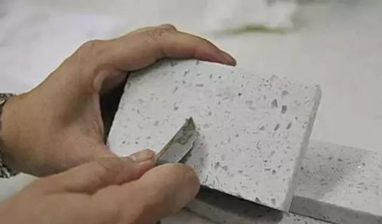 在石英石臺面用小刀刮一下,如果有粉末出現,那就是劣質的,如果沒有,就是優質的,因為石英石硬度高。