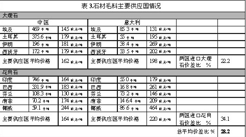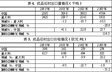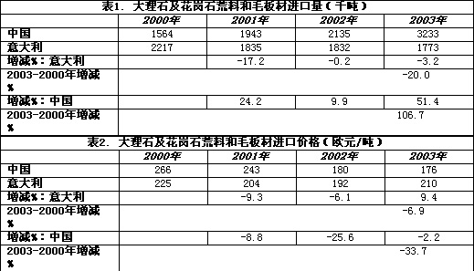 在石材http://www.stonebuy.com/毛料進口方面(見表1、2),中國http://www.stonebuy.com在2000年至2003年這四年期間的購買量翻了一番還多,同時相應的購買價格下降了33%;而意大利在同一時期內的石材http://www.stonebuy.com/荒料進口量降低了20%,雖然其購買價格也有所下降,但幅度僅為近7%。