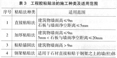 根據施工高度、施工基層條件不同,工程膠粘貼法的施工工藝又可分四種,其適用范圍如表3