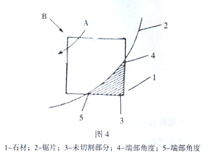 取斷面為120mmX120mm的石料,用超薄石材http://www.stonebuy.com/切割機切取塊厚5mm的超薄板。鋸片由在厚度0.17mm、內(nèi)徑305mm的不銹鋼基片內(nèi)周面設(shè)置厚度0.35mm的金剛石鋸刀而制成。將該鋸片安裝在切割機上,以1600/min切割速度邊旋轉(zhuǎn)邊切割,結(jié)果每塊薄板切割時間僅為105min,要槽僅為0.4mm,切割合格率達93%,且其表面平滑度高,便于下道研磨工序加工。而用在厚度5mm不銹鋼基片外周面設(shè)置厚度8.5mm金剛石鋸刀的傳統(tǒng)圓盤鋸進行切割,每塊薄板切割時間為2min,過程中鋸片出現(xiàn)擺動,切槽大,達9.0mm,切割合格率僅為36%。觀察證明,正如圖3所示,用超薄石材http://www.stonebuy.com/切割機,待切石材http://www.stonebuy.com/固定放置在鋸片內(nèi)面空間切割,在切割而未切割部分兩端部的角度大,達到45o~135o單位體積承受力小,有足夠的耐力防止邊角碎落,而用傳統(tǒng)圓盤鋸切割,未切割部分兩端部角度小至0o~45o,難以防止邊角碎落(見圖4)
