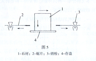 2、圖2是表示石材http://www.stonebuy.com/與鋸片位置關(guān)系的斜視圖。圖中表明,旋轉(zhuǎn)在鋸片內(nèi)側(cè)空間的石材http://www.stonebuy.com/沿鋸刀方向移動時,石材http://www.stonebuy.com/周面與鋸刀接觸,以圖3所示方式進行加割。切割時,除利用鋸刀機械http://www.stonebuy.com/machine/切割,也可同時利用電火花切割。也在鋸片上的適宜間隔設(shè)置導(dǎo)電部件;在每個導(dǎo)電部件間外加電壓,且在接觸石材http://www.stonebuy.com/的切割部位供入切割液。這樣可對石材http://www.stonebuy.com/產(chǎn)生電火花,使石材http://www.stonebuy.com/同時經(jīng)受機械http://www.stonebuy.com/machine/切割和電火花切割、加快切割作業(yè)。 3.鋸片由銷栓固定在環(huán)形體上(見圖5)。由于這樣的固定使鋸片具有張力,在高速旋轉(zhuǎn)下,鋸片充分保持平穩(wěn)性,增強鋸刀的剛性,避免擺,順利切割石材http://www.stonebuy.com/。鋸的基片用韌性和強度高的高碳素鋼或不銹鋼薄板制作。由鋸刀切出的石材http://www.stonebuy.com/薄板蓄放在存盤中。存盤安裝在豎向設(shè)置在操作臺上,且穿過旋轉(zhuǎn)軸的固定立栓的頂端。固定立柱裝有升降裝置。存盤也可設(shè)計懸掛式。