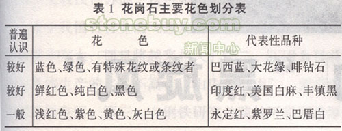 花崗石:藍(lán)色—綠色—黑色—純白色—紅色—黃色—紫色—灰白色—灰色(見表1)