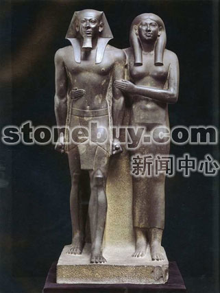 閃綠色粘板巖雕刻,高約142 厘米,約創(chuàng)作于公元前2600年,現(xiàn)收藏于美國波士頓博物館。這是埃及古王國第四王朝時期的一尊雙人立像,也是當(dāng)時帝王立像中最典型的代表。雕像刻劃的是埃及古王國第四王朝第五個法老門考拉和他的王妃 。