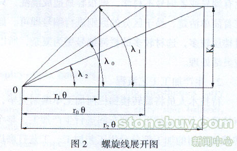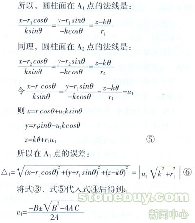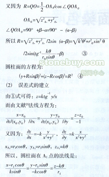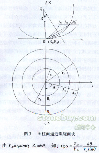 由所得誤差公式可知,△1、△2 顯然與β、θ等因數(shù)有關(guān),θ越小,則△1、△2越小,但石材http://www.stonebuy.com/板分塊越多,裝飾效果越差。所以θ要取適當(dāng)值,一般可以△1、△2小于3mm為限。由圖1可看出β<θ,而要使誤差達(dá)到更小則由誤差公式可得到β的最佳取值,這樣就能夠使圓柱面和螺旋面間的誤差較小。