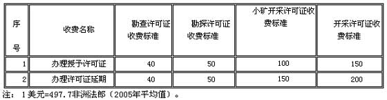 另外在授予或延長各類礦業許可證時要交納一部分費用(表1)。根據許可證的面積,一般每年還要交納少量的地租。例如,勘查許可證和勘探許可證第一階段地租標準為每年1000FCFA(非洲金融共同體法郎)/平方公里,第一次更新每年1500FCFA/平方公里;第二次更新每年2000FCFA/平方公里。采礦許可證地租標準為每年10萬FCFA/平方公里;小礦開采許可證每年5萬FCFA/平方公里。