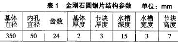金剛石圓鋸片工作時,鋸片的轉速往往是一個比較敏感的參數。速度的高低影響到圓鋸片的切削性能和切割表面質量,圓鋸片在高速切削過程中基體內離心力對鋸片穩定性影響不容忽視,有資料表明,鋸片在高速旋轉切削時,齒緣部分就可能變成荷葉狀。干切圓鋸片鋸切工作時,由于鋸片切削刃與被切割材料之間以及鋸片與切割面之間產生很大的摩擦而產生熱量,這樣在鋸片基體半徑方向上就形成了外高內低的溫度梯度,鋸片基體材料一般采用高錳鋼—65Mn,而65Mn具有過熱敏感性。因此切削熱使基體屈服強度降低,同時又增大了圓鋸片應力和變形,它不僅影響加工質量,同時也將嚴重影響鋸片的使用壽命。