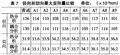 (4)其中A6和A9兩種鋸片徑向變形減小明顯,但A9鋸片切向變形和最大應力較大,因而建議在鋸片基體離中心孔約96mm處,開設8個均布的直徑約8mm的散熱孔,可取得較為理想的綜合效果。