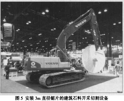 八、石材http://www.stonebuy.com/鋸切開采設備 展會中展出惟一的一款石材http://www.stonebuy.com/開采機械http://www.stonebuy.com/machine/,是一種由工程開掘機械http://www.stonebuy.com/machine/改裝而成的石材http://www.stonebuy.com/開采機械http://www.stonebuy.com/machine/。該機由鋸片動力頭和驅動車輛兩部分組成,驅動車輛可采用各種馬力的履帶式挖掘機(55一400馬力),鋸片動力頭組件安裝有液壓馬達驅動的切割鋸片,組件與去掉鏟斗的挖掘機臂末端連接,見圖5。