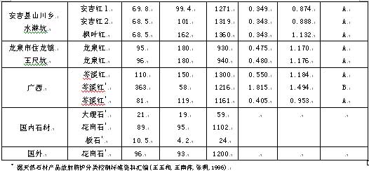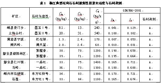 2002年,我們對浙江的天然石材http://www.stonebuy.com/進行放射性水平調查。調查采用天然露頭上測量巖石照射量率和室內測量巖石放射性核素兩種方法,并根據2001年12月10日,國家質量監督檢驗檢疫總局發布《建筑材料放射性核素限量》國家標準(GB 6566—2001)對13個典型花崗石材http://www.stonebuy.com/的放射性水平進行評價。涉及天然石材http://www.stonebuy.com/包括蕭山市大同塢鄉羊角山的“錢江紅”、諸暨市西巖鄉大灣的“西巖紅”、臨安縣橫畈鎮立塔的“天目紅” 、富陽縣新桐鄉的“杭灰”大理石及泰順龜湖后章崗的“龜湖青”等,嵊縣嵊縣“墨玉”、黃巖的“松花綠”、“滿天星”、磐安的“紫檀香”、“一品紅”和嵊州“東方紅”、安吉的“安吉紅”、龍泉的“龍泉紅”等黑色、淺色、紅色花崗石系列(表1)。