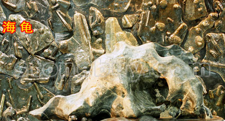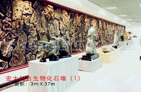 《古生物化石墻》,億萬年前,古代生物的遺體、遺跡,能保存為化石的機會是很少的,本苑墻面上鑲嵌的化石,系距今3億年前生活在晚古生代泥盆紀海洋中的震旦角和三葉蟲。該生物以食腐泥為生,底棲爬行,或作短距離游泳。該化石墻面積達120余平方,耗用化石板40噸。這批化石發掘于湖北與四川交界處的同一石窩,其存量之大,形體之美,世所罕見。金山先生采集后將其層層剝離,打磨出部份形態以獨到的構思鑲嵌于墻并飾以恐龍蛋、劍齒虎等珍稀古生物化石及大型天然石鱷魚、恐龍、蜥蜴等,使該墻不僅具有珍貴的科研價值,也具有難得一見的觀賞價值。