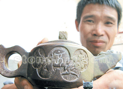 曾以燈泡微刻創下吉尼斯世界紀錄的江西大余縣南安http://www.shicai.com.cn/鎮民間工藝美術師胡潤生,日前在家中向人們展示他新近創作完成的一件石藝雕刻作品——“動感奧運”石壺。www.stonebuy.com