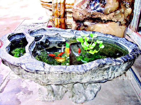 “天然形成,千古一絕,靈璧石,標價:200萬”看著貼在魚缸前那張紅紙上的字,不但記者忍不住要駐足,每一個路過的市民都停下來研究了一番。記者粗略丈量了一下,這個魚缸長約1.30米,最寬處0.70米,底部帶魚缸整體高0.68米。魚缸形成一大一小兩個池,大池長約0.50米、寬0.30米,小池長0.44米、寬0.16米。令人稱奇的是,大小池的底部是相通的,養在魚缸中的幾條錦鯉不時在兩池間往來游弋。緊靠小池處,還有一個巴掌大小的“象鼻山”。魚缸的邊緣厚約6厘米,布滿石紋的石皮(行業稱呼,指石頭的外表)光滑無比,底部的四個石柱也布滿了石紋,一些地方還出現了石筋。www.stonebuy.com