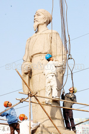 昨日上午9:00,十幾個工人一起將金山石的范仲淹雕像用鋼繩綁牢,裝上平板車移進木瀆公園。至此,輕軌一號線沿線首個文化建筑被成功搬移。www.stonebuy.com