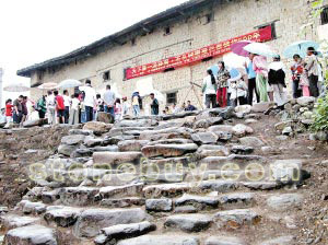 在廖屋村石頭城,記者看到,占地面積2600平方米的石頭城面朝小河建于一座小山之上,兩邊各建有18級石階,泥磚圍又建在石頭城上,樓高三層,正視東方。