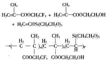 將部分甲基丙烯酸三氟乙醋、甲基丙烯酸輕乙酯、乙烯基三乙氧基硅烷單體和部分引發劑一起加人到溶劑中,待引發劑溶解后倒入250m1的四口燒瓶中,加熱攪拌聚合反應1h后,將剩余引發劑和單體分2h滴完,再反應1h后冷卻出料。www.oacwf.cn