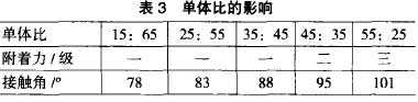 引發聚合形成聚合物的聚合度與引發劑濃度的平方根呈反比,即引發劑用量增加,聚合度下降,分子量降低,聚合物強度下降,鉛筆硬度下降,從引發劑AIBN用量為0.2%時的4H下降到引發劑用量為0.6 %時的2H。當引發劑用量為0.1%時,共聚物是淡黃色液體,和水的鉆度相當,可以知道引發劑沒有引發單體聚合反應。當引發劑用量為0.7%時反應很是劇烈,在短時間內迅速聚合反應凝膠,反應很難控制。(反應的溫度控制在85 }C)從表1可知引發劑的用量應控制在0.2%一0.6 % 。