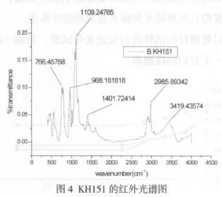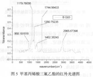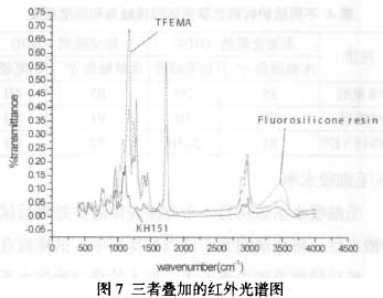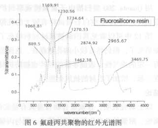 圖6是氟一硅一丙共聚物紅外光譜圖,1734-1744cm處為羧基或碳基吸收峰;圖4, 5中968crn 是C=C伸縮振動峰,而圖6氟一硅一丙共聚物譜圖中在此處無吸收峰,說明體系中C=C雙鍵基本反應完全,據此判斷氟單體和硅單體和丙烯酸酯單體反應物幾乎全部參加了聚合反應;圖4, 5, 6中2965-2985crn處為一CH3伸縮振動峰;圖4中1109-1179cm處為Si一O伸縮振動的特征吸收峰;而圖6和圖5中1290cm處出現的吸收峰則是C一F鍵伸縮振動特制峰;由于F元素的電負性誘導效應,圖譜中1731cm處的C=O鍵伸縮振動峰向高波數發生了位移通過紅外光譜的分析可以推斷,氟單體和有機硅單體和丙烯酸酯單體發生了共聚反應。