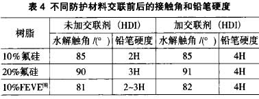 由表4可知,在交聯劑HDI三聚體的作用下發生交聯固化反應,使得聚合物物理力學強度增大,鉛筆硬度從2H提高到4H,但水的接觸角幾乎不變。同時20 %氟硅共聚物比10%FEVE樹脂有更好的接觸角。p