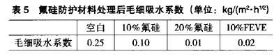 由圖9所示,并計算毛細吸水系數W24(表6)可知:經防護處理后,試樣得毛細吸水系數都有了不同程度的降低,說明其憎水性有明顯的提高。其中以20%氟硅防護材料體系處理后憎水性最好,基本上無毛細現象。而10%氟硅防護材料體系由于其濃度較低,表面成膜不完整,所以憎水效果不太理想。10%FEVE樹脂處理后,其毛細現象也不明顯。