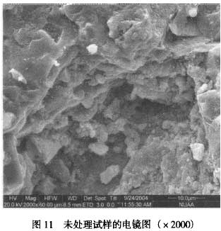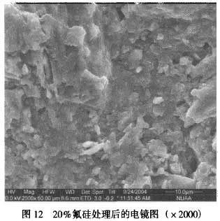 用Quanta 200型掃描電子顯微鏡觀察封護處理前后試樣:圖11中空白石材http://www.stonebuy.com/試樣有較大的孔隙和凹洞。圖12中可以看見其凹洞被氟硅材料填充了,大孔隙消失了,但仍然有較小的孔隙存在,這保留了石材http://www.stonebuy.com/有一定的透氣性;表面零散的碎片也被防護材料粘結在一起,增加了石材http://www.stonebuy.com/的抗風化能力。