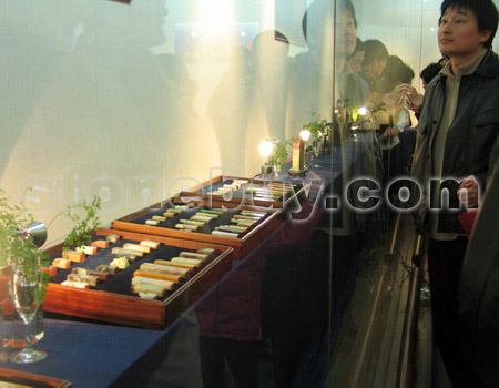 此次展示匯萃了昌化、青田、壽山、巴林四大傳統名石,印石方面,有保存至今且十分稀少的名貴品種壽山、荔枝凍石,據了解,此套荔枝凍石石性凝結,透明度極好,肌理具蘿卜絲紋外有白色結晶體,當稱荔枝凍"尊品",原石在1987年采得,于2007年6月始制成套章12方,且其印材大部份在5cm*5cm方章以上,如此成套大材印石迄今仍尚未發現。www.stonebuy.com