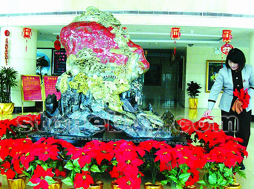 2月13日,一件題名為《錦繡河山》、來自浙江青田的雞血石亮相安徽繁昌一大酒店大廳內,這件重達800余斤的青田雞血石堪稱“雞血石王”。