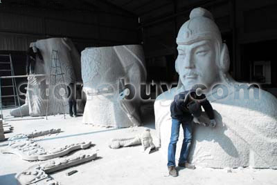 石雕是由沈陽魯迅美術學院民族傳統雕塑系研究生導師、著名雕塑家賀中令教授創作,吸納了明代武將石雕雄壯厚重、精工雕刻的傳統風格,戰袍上的云龍、山水紋飾,采用明代武服閩南繡風,袍底邊的山水雕出海浪翻騰氣氛。www.stonebuy.com