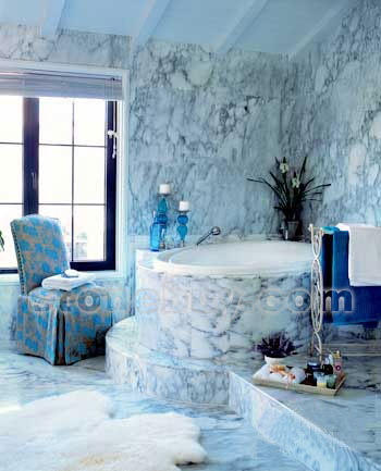 3.大理石的浴缸讓人感覺有些清冷,而那些看似隨意、實為用心搭配的質地柔軟、色彩柔和的織物,可以增加浴室的溫暖感,再加入一點藍色飾品的點綴,視覺更加豐富、明朗。