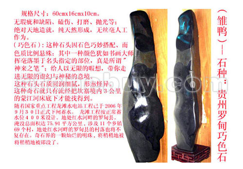 羅甸奇石屬“碳酸鹽石”,質(zhì)地堅硬(6.5度左右)、光滑,同時個性十分鮮明,其形狀千姿百態(tài),以抽象、夸張著稱;其色調(diào)以黑色為主,被譽為“黑珍珠”。www.oacwf.cn