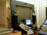 大理石背景墻:古樸的花色符合客廳內的陳設,光滑的表面與如鏡的電視屏幕呼應。