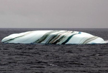 他說:“它讓我想起小時候買的一種糖果。冰山約50米長,9米高?!睅滋旌?,科考船又發現了另一座有斑紋的冰山,這座冰山高出水平面約30米,這次是明顯的藍色斜紋圖案?!癎 O 明星”船上的坦吉說:“我們不知道這些冰山形成了多少這種條紋圖案,是否有人幫助完成,總之,是有點神秘。也有人相信條紋形成是因為多年來冰壓縮比率不同造成的。而有些科學家認為,是冰川中的礦石渣所致。我認為它們形成了美麗的圖案,我非常喜歡,這也是我拍下來的原因?!?/FONT>