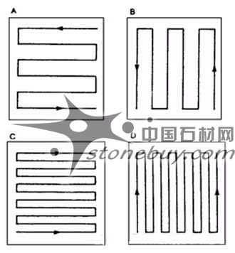 拋光磨頭的運(yùn)行方式要和粗磨、細(xì)磨磨頭的運(yùn)行方式配合進(jìn)行。磨頭運(yùn)行方式有縱向橫向和疏密程度之分,如圖3所示。一般來(lái)說(shuō),粗磨時(shí)采用A運(yùn)行方式;細(xì)磨時(shí)采用A+B運(yùn)行方式,拋光時(shí)則采用A+B+C+D運(yùn)行方式,根據(jù)具體情況可重復(fù)再磨一次可獲得較高的表面光澤度。