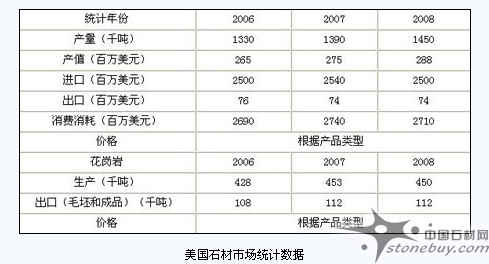 美國依舊是世界上最大的石材http://www.stonebuy.com/(板材類產(chǎn)品http://www.stonebuy.com/sample/)市場http://www.stonebuy.com/enterprise/FuJian/QuanZhouShi.html,石材http://www.stonebuy.com/進(jìn)口總值為25億美元,和2007年相比下降越1.6%。石材http://www.stonebuy.com/的出口http://en.stonebuy.com/依舊停留在7400萬美元。美國國內(nèi)石材http://www.stonebuy.com/市場http://www.stonebuy.com/enterprise/FuJian/QuanZhouShi.html消費約在27.1億美元,比2007年下降了3000萬美元,減少也是差不多1%多一點。美國的石材http://www.stonebuy.com/裝修和使用主要集中在商業(yè)和住宅市場http://www.stonebuy.com/enterprise/FuJian/QuanZhouShi.html,全球金融危機(jī)對美國石材http://www.stonebuy.com/生產(chǎn)和石材http://www.stonebuy.com/進(jìn)口造成短期的影響。