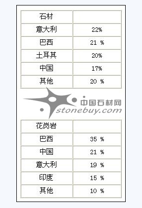 按重量來算,整體的石材http://www.stonebuy.com/銷售情況是:35%石灰?guī)r、32%花崗巖、11%其他石材http://www.stonebuy.com/、12%砂巖、3%大理石、1%板巖。