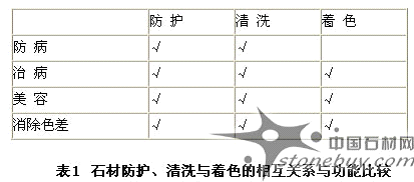 表1為石材http://www.stonebuy.com/防護、清洗與著色的相互關系與功能比較。