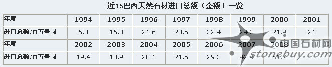 巴西歷年天然石材http://www.stonebuy.com/出口http://en.stonebuy.com/產(chǎn)值(金額)一覽表