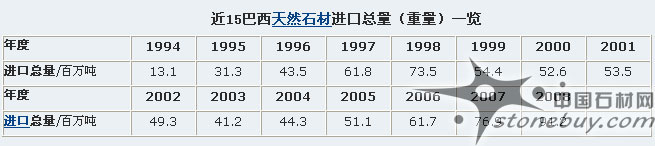 巴西歷年天然石材http://www.stonebuy.com/出口http://en.stonebuy.com/數(shù)量(重量)一覽表