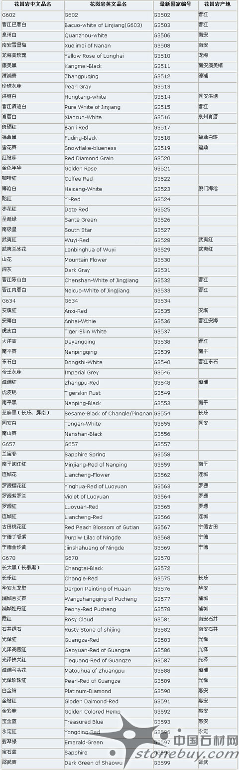 福建http://www.zongyi.com.cn/主要花崗巖品種、中英文名、產地及其最新的石材http://www.stonebuy.com/統一編號匯總。