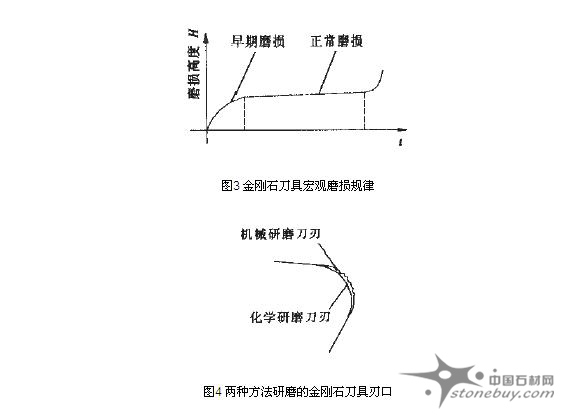 金剛石刀具的磨損機理比較復雜,可分為宏觀磨損與微觀磨損。前者以機械http://www.stonebuy.com/machine/磨損為主,后者以熱化學磨損為主。宏觀磨損的基本規律如圖3所示,早期磨損迅速,正常磨損十分緩慢。通過高倍顯微鏡觀察,刃口質量越差及鋸齒度越大,早期磨損就越明顯。這是因為金剛石刀刃圓弧采用機械http://www.stonebuy.com/machine/方法研磨時,實際得到的是不規則折線(見圖4),在切削力作用下,單位折線上壓力迅速增大,導致刀刃磨損加快。另一個原因是,當金剛石刀具的刃磨壓力過大或刃磨速度過高,及溫度超過某一臨界值時,金剛石刀具表面就會發生氧化與石墨化,使金剛石刀具表面的硬度降低,形成硬度軟化層。在切削力作用下,軟化層迅速磨損。由此可見,金剛石刀具刃磨質量的高低會嚴重影響它的使用壽命與尺寸精度的一致性。