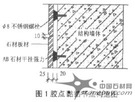 施工工藝:①清理墻面基層及測(cè)定,用鋼絲刷鋼纖等手持工具將墻面殘余物清除干凈,認(rèn)真核實(shí)墻面平整度和垂直度,記錄好實(shí)際偏差并作出標(biāo)志;②測(cè)量劃線,根據(jù)標(biāo)高控制線結(jié)合石材http://www.stonebuy.com/板塊尺寸,按照膠點(diǎn)位置在墻面上彈出分格線,同樣在石材http://www.stonebuy.com/背面彈線確定相應(yīng)膠點(diǎn)部位;③膠點(diǎn)處基層處理,用打磨機(jī)將墻立面上膠點(diǎn)位置處和石材http://www.stonebuy.com/背面相應(yīng)膠點(diǎn)位置處磨出新搓,面積為50m m見方;④墻面鉆孔,在墻面的膠點(diǎn)處鉆直徑12m m、深> 100m m的孔,將孔內(nèi)垃圾沖洗干凈;⑤配置黏結(jié)膠,按體積比(甲組分:乙組分=2 :1}進(jìn)行,在干凈的容器內(nèi)配置;兩組分混合時(shí)一定要把膠從底部翻起混合均勻,配置好的膠必須在30m in內(nèi)用完,做到邊拌合邊粘貼施工;⑥植筋,將已配置好的膠注入鉆的孔內(nèi)填滿,根據(jù)墻面平整度和垂直度測(cè)量結(jié)果,在孔內(nèi)植入110m m長(zhǎng)不銹鋼螺桿,保證螺桿外露端頭在同一平面內(nèi);⑦粘貼石材http://www.stonebuy.com/,將配兌好的強(qiáng)力膠點(diǎn)涂在石材http://www.stonebuy.com/背面磨出的新搓上,每塊石材http://www.stonebuy.com/一般有8個(gè)以上的膠粘點(diǎn),膠點(diǎn)距塊材長(zhǎng)邊邊緣 20cm ,距短邊邊緣12cm,涂膠點(diǎn)40mm-50mm。涂膠時(shí)將膠放在石材http://www.stonebuy.com/背面粘貼處來回揉搓,使膠液充分濕潤(rùn)粘貼處面。再用工具將膠旋攪堆成塔狀膠柱,膠柱高度不低于20m m,將塊材安裝到設(shè)定部位。仔細(xì)調(diào)整塊材的平整度和垂直度、標(biāo)高及周邊縫寬,停置4m in即可完成。在膠液終凝前要注意板材表面的平整度。膠點(diǎn)黏結(jié)節(jié)點(diǎn)構(gòu)造見圖1。