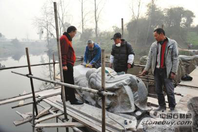 龍腦橋的橋墩、橋板均為巨石。橋板石30塊,最大單重約5.9噸;橋墩石56塊,最大墩石(龍體巨石)整石重約13.6噸。 根據“修舊如舊”文物修復要求,使用材料盡量采用原建筑材料及構建,與原來的石質一致。尋找材料就成了當務之急。文物工作者溯河而上,找到三個地方的石料與龍腦橋石橋的石料進行比對,經過專家學者的“DNA式”的鑒定,斷定這些石材http://www.stonebuy.com/,來自九曲河上游一個叫鹽灘壩的地方。