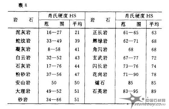 肖氏硬度“符號Hs表示。肖氏硬度測試的工作原理是將金剛石沖頭先升高到固定的高度h,上銷緊,然后釋放銷緊機構.使沖頭下落到試件表上又回彈到某一高度h。,根據回彈高度h:的大小來確定肖氏硬度Hs的值。各種巖石的肖氏硬度值見表8中所示。