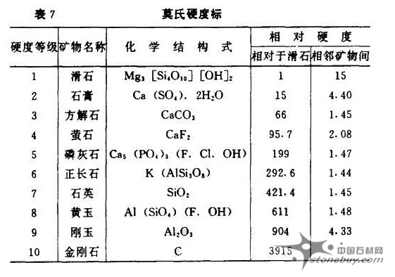 相對硬度:選用10種礦物為標準,按其相對硬度的大小分為10級。相對硬度是由礦物學家莫爾制定的,所以也稱之為莫氏硬度。莫氏硬度不具有嚴格的量化標準,因此在分析石材http://www.stonebuy.com/的性能中較少應用,但因為莫氏硬度使用方便,所以在缺乏專用設備時可用以大致地判斷巖石的類型或礦物種類。
