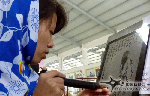 在惠安縣一家民間石雕工藝創作室內,一名技師在制作石雕影畫工藝品。