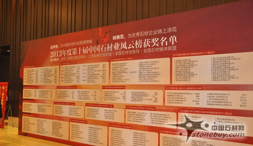 “2013年度中國http://www.stonebuy.com石材http://www.stonebuy.com/業十大領軍企業http://www.stonebuy.com/enterprise/、十大領軍人物、十大杰出青年、中國http://www.stonebuy.com石材http://www.stonebuy.com/業質量金獎、品牌金獎、誠信經營金獎、石材http://www.stonebuy.com/礦山20強、石材http://www.stonebuy.com/工程20強、石材http://www.stonebuy.com/機械http://www.stonebuy.com/machine/工具十強、異型雕刻十強、養護施工、人造石十強”等最具權威和影響的榜單和榮譽隆重揭曉!中國http://www.stonebuy.com石材http://www.stonebuy.com/業風云榜不光是對行業優秀企業http://www.stonebuy.com/enterprise/和人物的肯定和嘉獎,更是樹立了行業的標桿,打造了品牌效應,發出了中國http://www.stonebuy.com石材http://www.stonebuy.com/業的正面聲音,是石材http://www.stonebuy.com/人努力拼搏頑強奮進的精神寫照。