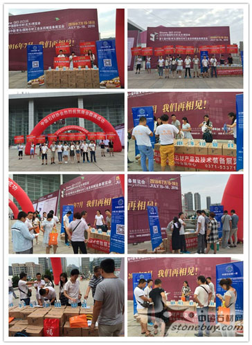 2015年7月17日“中原石材http://www.stonebuy.com/第一展”重磅出擊青島!精英宣傳團隊一行20人去到“青島國際石材http://www.stonebuy.com/工業及機械http://www.stonebuy.com/machine/設備展覽會”現場火熱開展宣傳工作。此次宣傳工作,“中原石材http://www.stonebuy.com/第一展”在開展日常宣傳工作之余特推出“掃碼送清涼”活動,攜帶礦泉水一萬余瓶、宣傳紙巾兩萬余份,在炎炎夏日為各位參展商及觀眾送去涼爽!