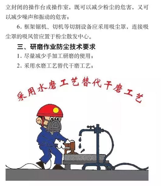 6、石材http://www.stonebuy.com/加工生產企業http://www.stonebuy.com/enterprise/存在的主要職業病危害是矽塵。因為石材http://www.stonebuy.com/加工的主要礦物成分都是二氧化硅(SiO2),在生產過程中都會產生大量矽塵(矽塵是指游離二氧化硅含量在 10%以上的粉塵),作業人員吸入矽塵,就會患矽肺病。矽肺病早期可能沒有什么異常,發病后常出現咳嗽、氣促、胸悶、胸痛、呼吸困難、肺氣腫,易并發肺結核和肺癌等。