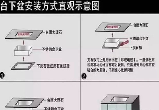 2、洗面臺下盆與洗菜臺下盆臺面開口大小與盆的關系嚴格按照臺下盆廠家提供的安裝圖表開口;